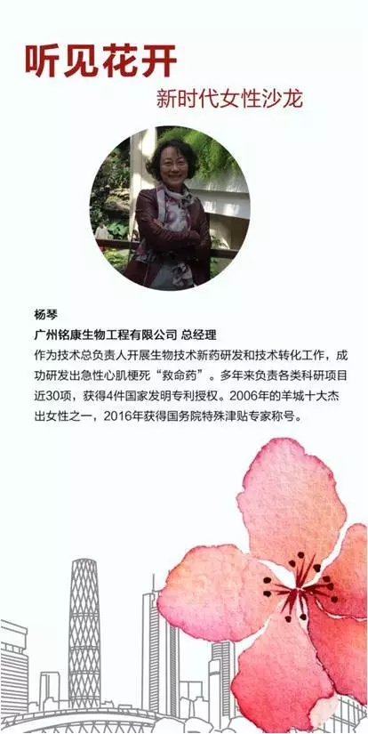 活動(dòng)現(xiàn)場氣氛熱烈,座無虛席。女企業(yè)家們暢所欲言,通過分享創(chuàng)業(yè)經(jīng)歷和感想,以及事業(yè)和家庭上的體驗(yàn),表達(dá)她們對(duì)新時(shí)代女性的看法和期望。作為嘉賓之一,我司楊琴女士向觀眾道出自己軍人出身創(chuàng)業(yè)研發(fā)急性心肌梗死藥物銘復(fù)樂的初衷:想縮短我國生物技術(shù)藥物研究及溶栓治療水平與國際先進(jìn)水平的差距,也是為了讓我國心腦血管患者能夠用上新型溶栓藥。在“如何創(chuàng)造更利于女性發(fā)展的職場”話題中,楊琴女士認(rèn)為女性的認(rèn)真細(xì)心與堅(jiān)韌不拔的品質(zhì)在生物醫(yī)藥研發(fā)上更能發(fā)揮作用。銘復(fù)樂作為迄今唯一可單次靜脈推注的溶栓藥,具有使用方便、適合急救,可院外溶栓的顯著優(yōu)勢(shì),但因其為高難度、高復(fù)雜度基因重組藥物的典型代表,必須使用哺乳動(dòng)物細(xì)胞表達(dá)生產(chǎn),研發(fā)團(tuán)隊(duì)艱苦研究開發(fā)了15年才終于實(shí)現(xiàn)銘復(fù)樂的產(chǎn)業(yè)化并正式上市。在問及心目中最能代表理想女性的花時(shí),楊琴女士回答木棉花,不僅因?yàn)樗菑V州市市花,更因?yàn)椤吨孪饦洹分心久抟詷涞男蜗笈c橡樹站在一起,女性就要像木棉一樣,自信自立自強(qiáng),世界才會(huì)更加美好!