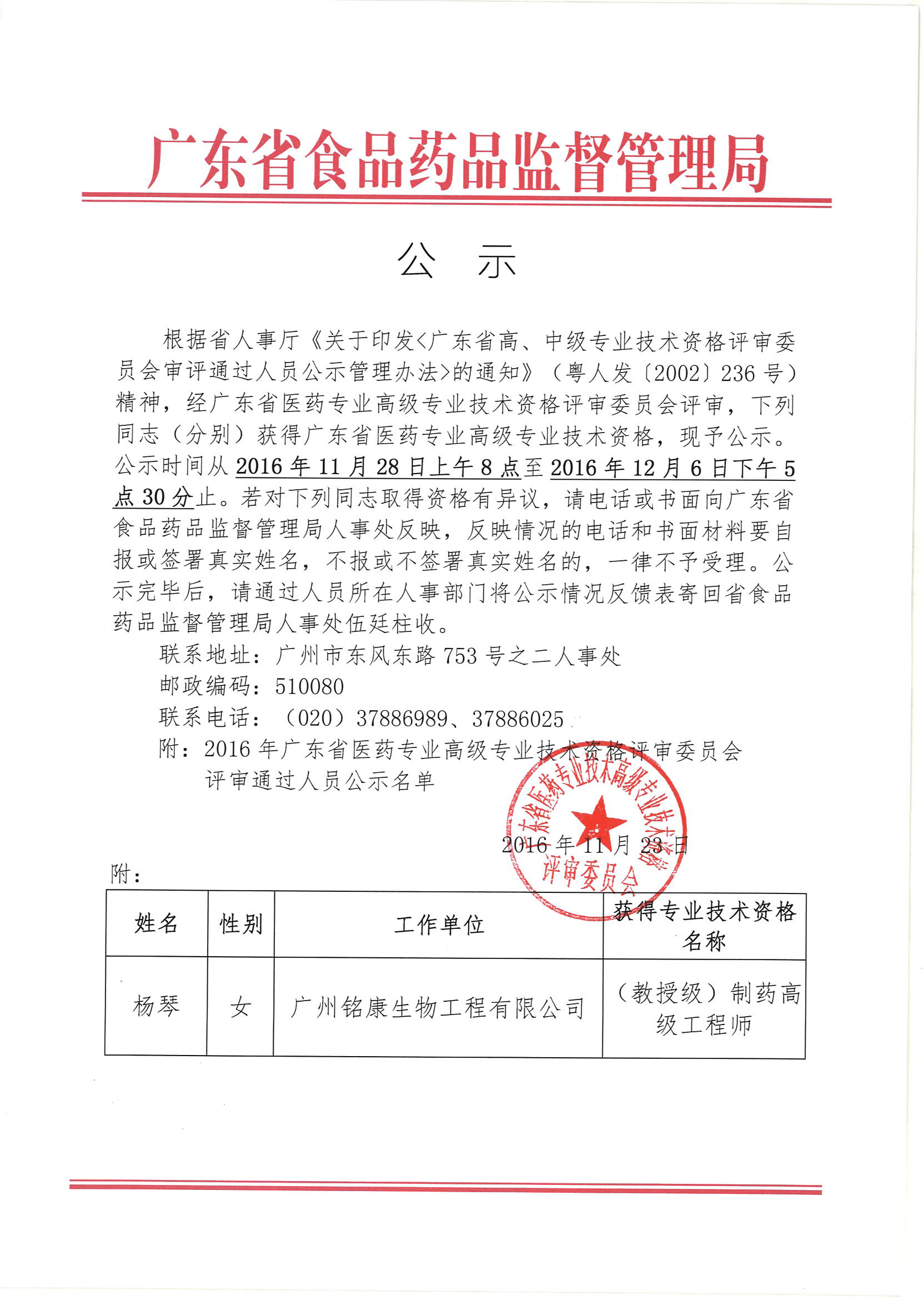 關于楊琴同志獲得廣東?。ń淌诩墸┲扑幐呒壒こ處煂I(yè)技術資格的公示