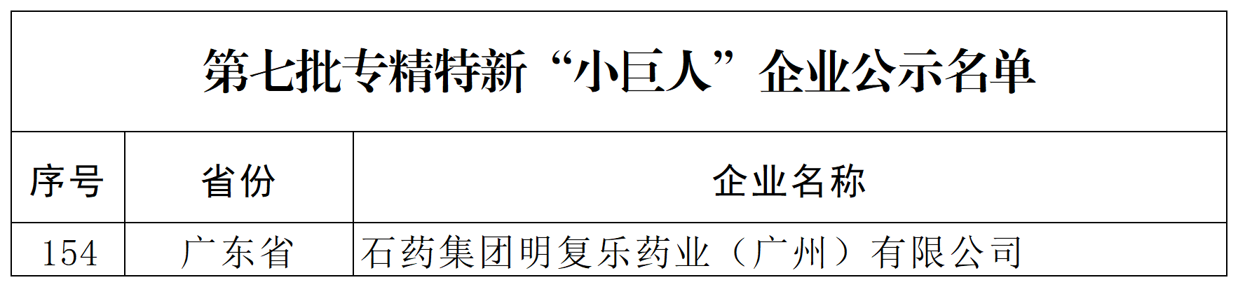 近日,廣東省工業(yè)和信息化廳公示了第七批專精特新“小巨人”企業(yè)名單。石藥集團明復樂藥業(yè)(廣州)有限公司(下稱:石藥明復樂)成功入圍,通過了國家工業(yè)和信息化部的認定,榮獲國家專精特新“小巨人”企業(yè)稱號。