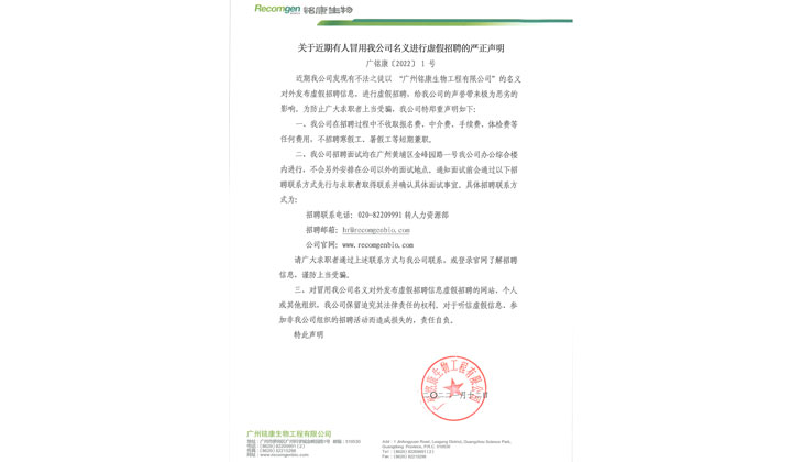 關(guān)于近期有人冒用我公司名義進行虛假招聘的嚴正聲明