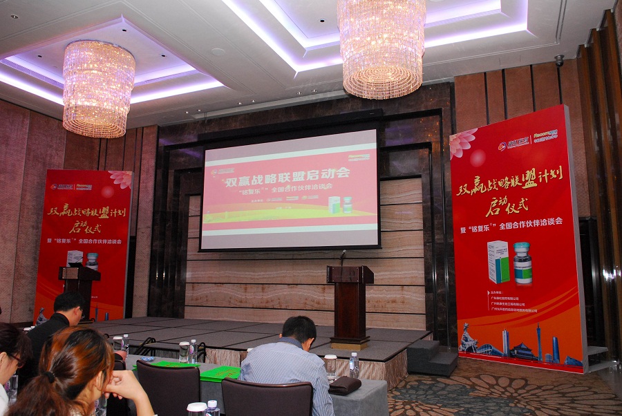 2014年11月26日,公司歷經(jīng)十余年潛心研究并成功開發(fā)的首個(gè)重磅產(chǎn)品——第三代溶栓藥銘復(fù)樂®全國招商會(huì)在廣州四季酒店隆重召開。楊琴總經(jīng)理代表銘康生物在大會(huì)致辭,介紹銘復(fù)樂®的研發(fā)歷程,推出 “一三五”戰(zhàn)略發(fā)展規(guī)劃,即一年內(nèi)產(chǎn)品投放市場,三年內(nèi)其治療腦梗死和肺栓塞的新適應(yīng)癥完成臨床試驗(yàn),五年內(nèi)銷售額突破十億元大關(guān)。